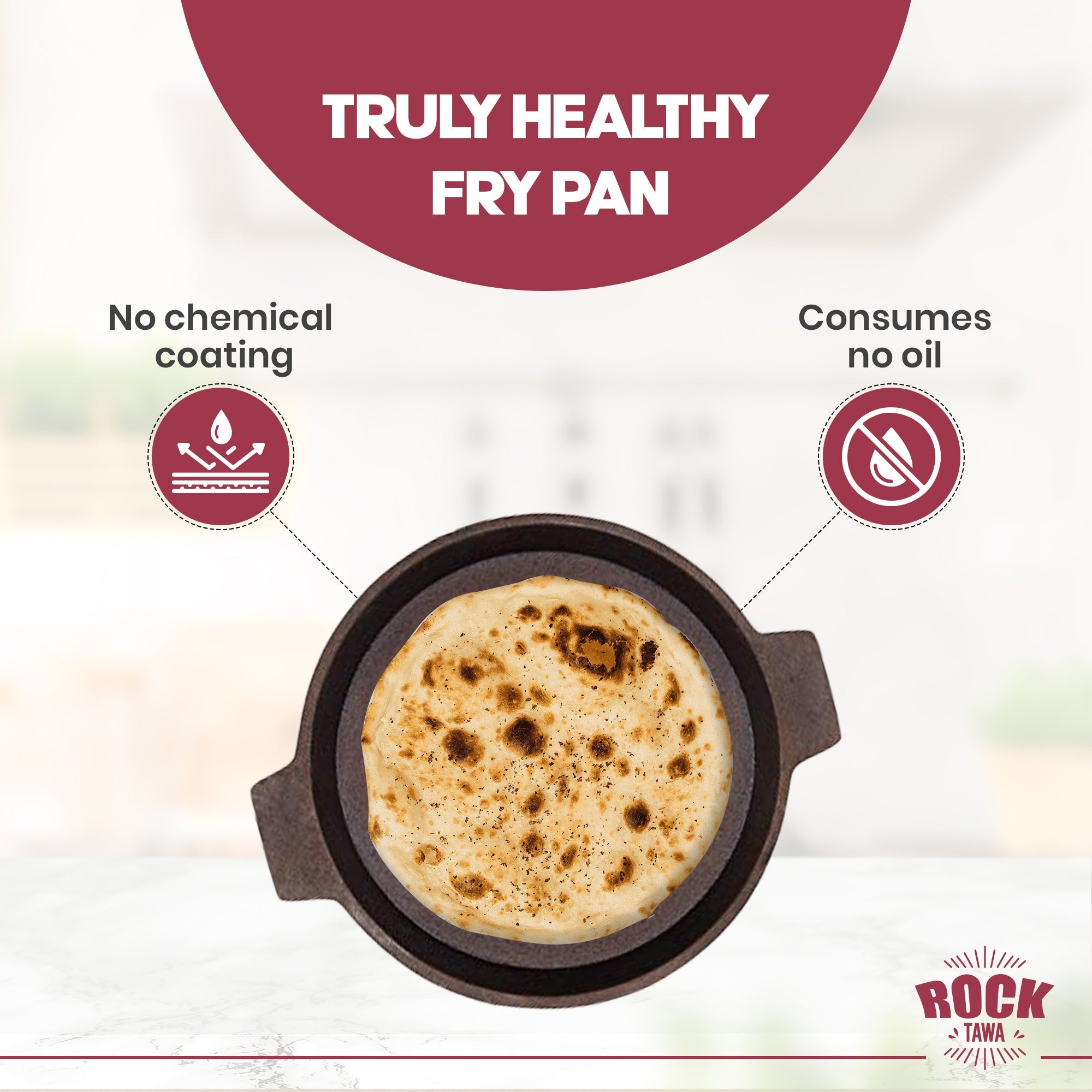 Roti Tawa 8 In Pre-Seasoned Cast Iron Skillet for shallow frying This rock dosa/roti tawa is 8 inch in diameter which is highly useful to make rotis. Though the product is heavy, cast iron’s durability is what makes the product stand out. It is 8 inch in diameter it is 1.5 kgs heavy and 5mm in thickness, pre seasoned with sunflower oil. The distribution of heat would be even which would make your parathas soft and delicious.